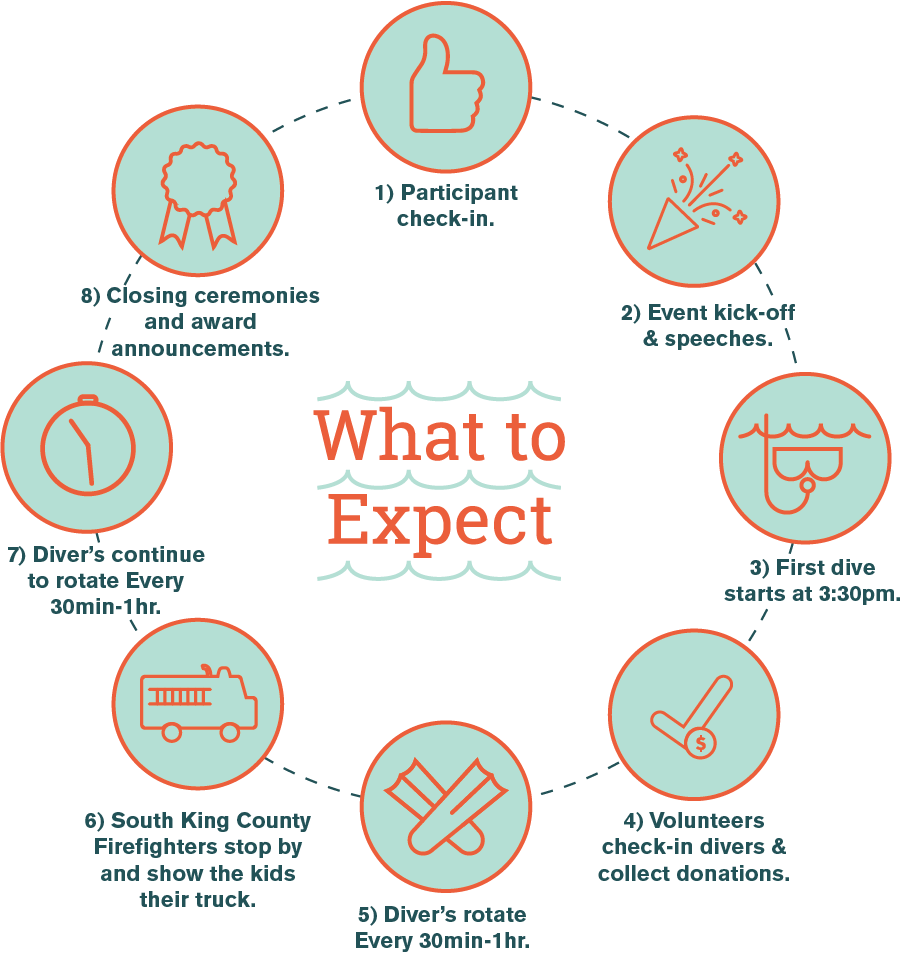 Each year we meet for an annual 24-hour Dive-a-thon event. Over 100 scuba divers take turns diving in pairs for thirty minutes to an hour. The idea is to have someone in the water at all times during the 24-hour period. Cancer doesn't sleep, and for one night, neither do we. Fundraising occurs prior to and during the event. All proceeds raised benefit cancer research at Seattle Children's Hospital. We have an amazing group of volunteers and can always use an extra helping hand. Join us as we dive in to put an end to childhood cancer!